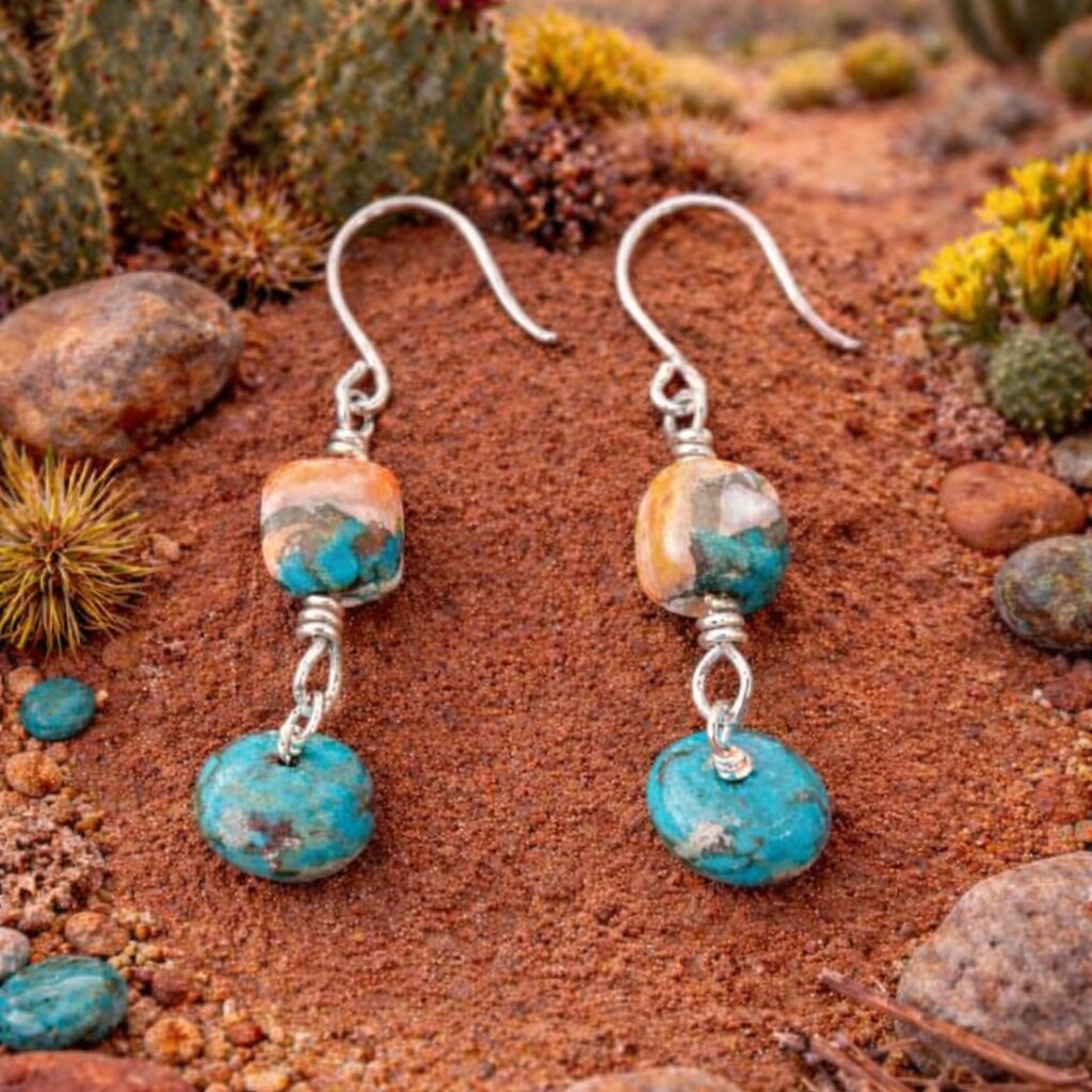• Sterling wrapped wire dangle spiny oyster gems and turquoise from Arizona